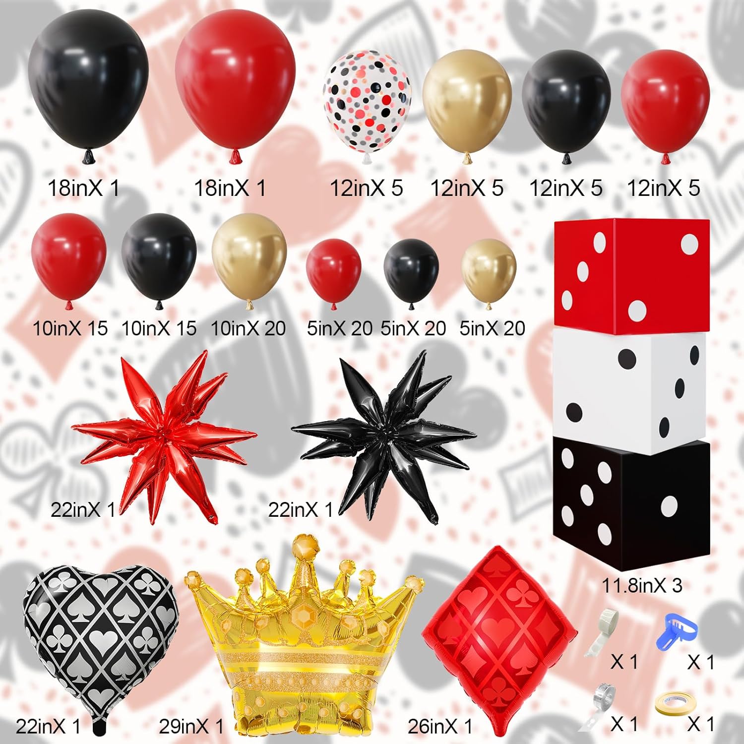 Casino Theme Party Decorations: Our package includes 12” dice favor boxes (3 pcs), 22” foil balloon(1red/1black),2 pcs poker theme foil balloons, 1 pcs crown foil balloon, 18″ red/black balloons(2 pcs),12″ red black confetti balloon(5 pcs),12″ red/black/metal gold balloons(15 Pcs),10” red/black/metal gold balloon(50 Pcs), 5” red/black/metal gold balloons(60 Pcs), 4pcs balloon tools; Use our exquisite casino balloons to make your space a charming casino party decorations