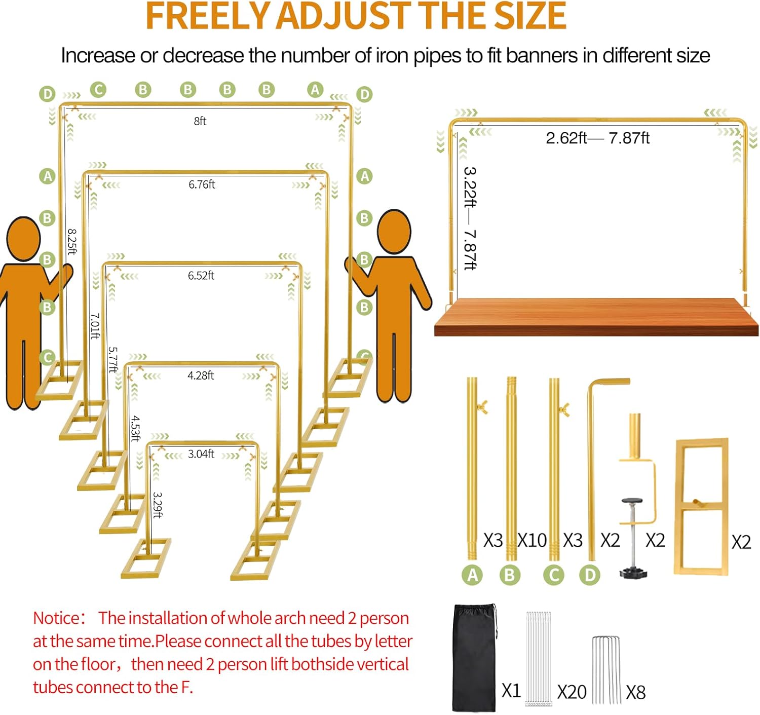 8.2FT Square Backdrop Stand,Wedding Arch Heavy Duty Adjustable Stand, Change Over The Table Rod Stand with Clamps,Metal Gold Balloon Arch Frame for Parties Decor(Two Person Installation)