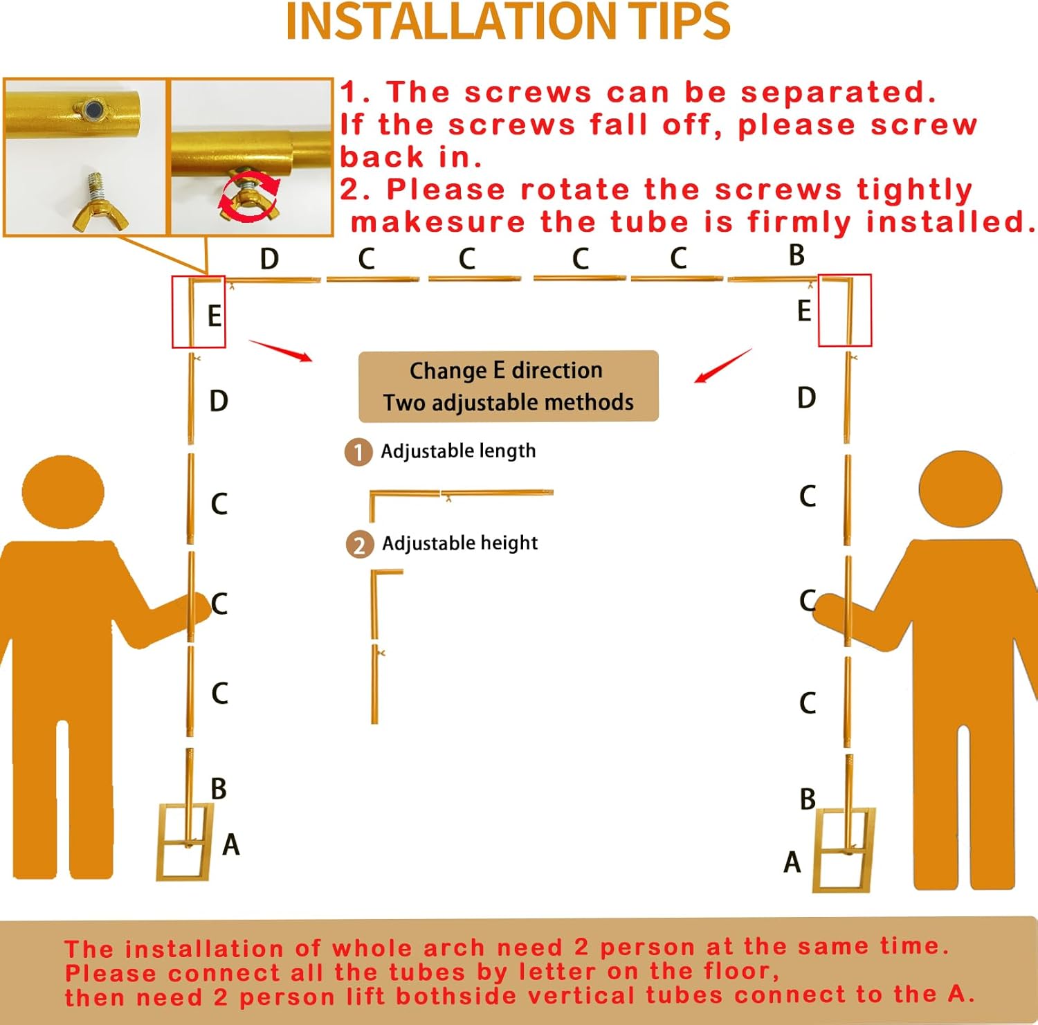 INSTALLATION TIPS:1. The screws can be separated. If the screws fall off, please screw back in. 2. Please rotate the screws tightly makesure the tube is firmly installed.3. Two people are needed to simultaneously lift the 8.25 ft risers on both sides of the stand and ensure that the screws connecting them to the base are tightened.