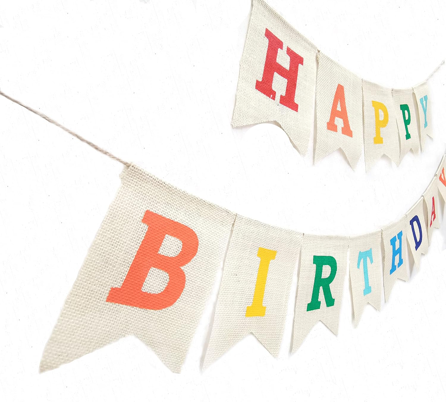 Clear and Bright Happy Birthday Garland: Rainbow HAPPY BIRTHDAY sign burlap are printed on bright beige banner. Lovely bright colors, great decoration for colorful birthday party.