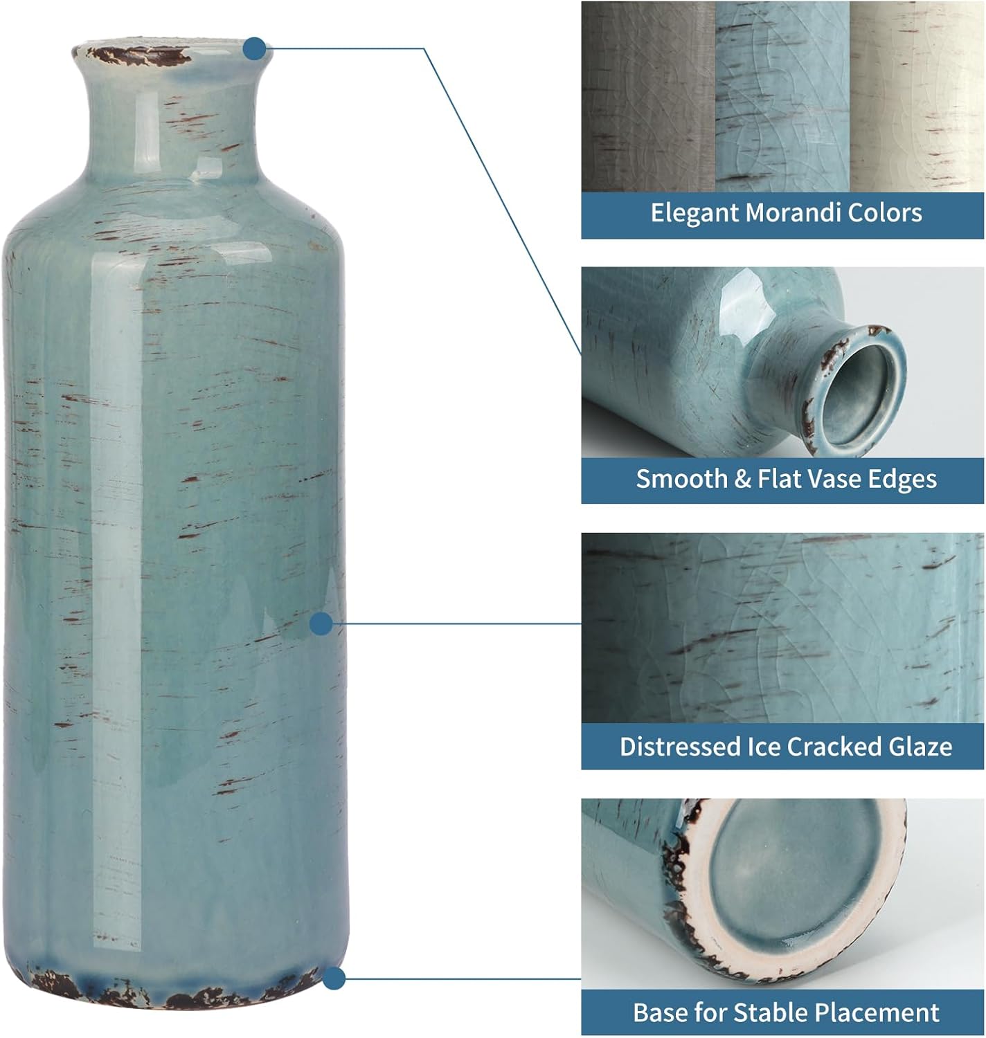 Elegant Look: The distressing techniques are adopted to make these three vases so stunning. There is crackled rustic design on the surface of the vases They fit various types of styles, such as modern farmhouse, rustic, classic charm, country, and elegant yet simplistic. The sizes and shapes of these three vases are specially designed, they are in perfect harmony while using together.
