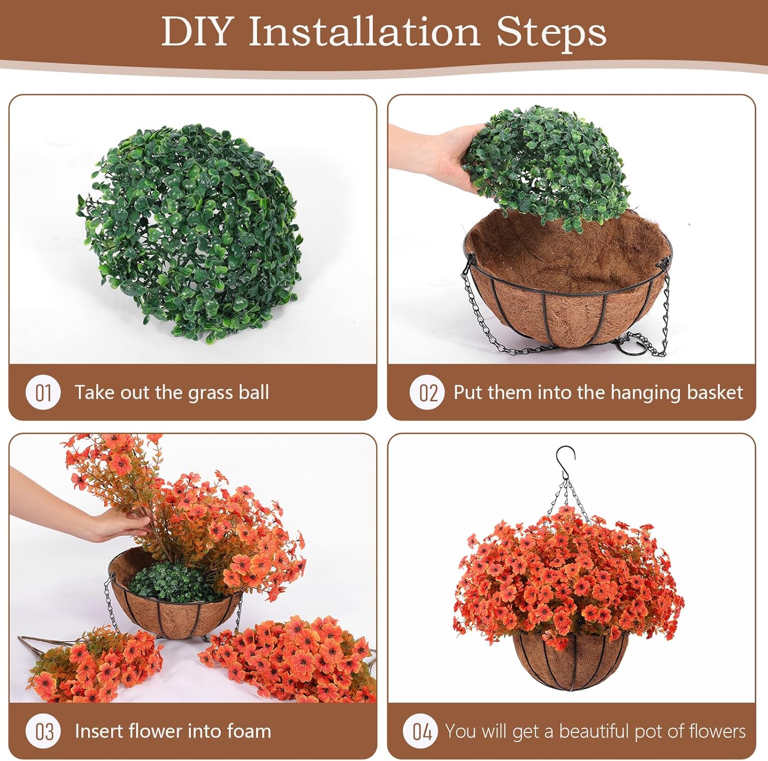 Good Quality: The hanging basket and artificial outdoor flowers were made of good quality material that don’t require maintenance after assembly. It’s UV resistance and won’t fade, sturdy enough for any weather. No watering needs. It looks full and beautiful all season.