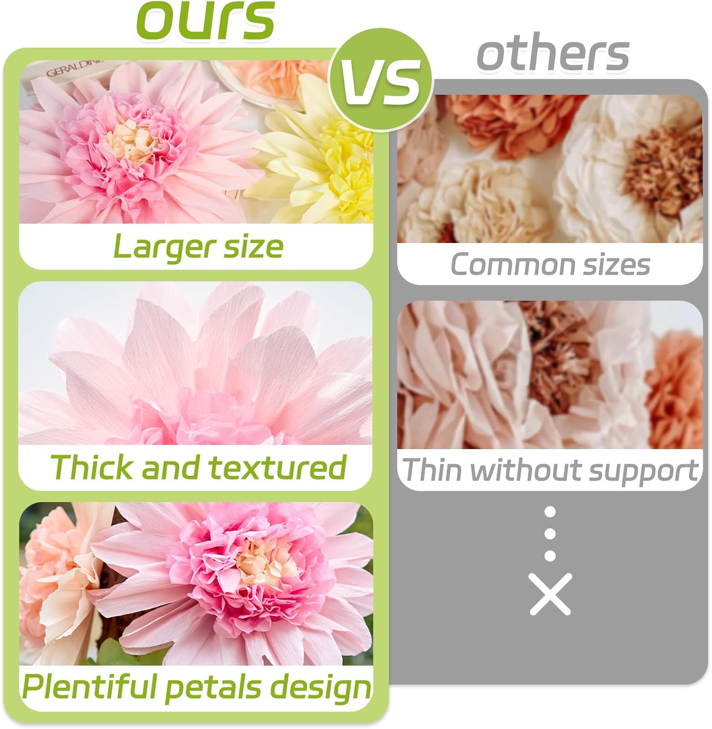 Variety & Quality Materials – Includes 6 pieces of 12-inch flowers made of thick, textured crepe paper for added support and elegance, along with 6 delicate 6-inch flowers crafted from soft tissue paper for a balanced and versatile decor set.