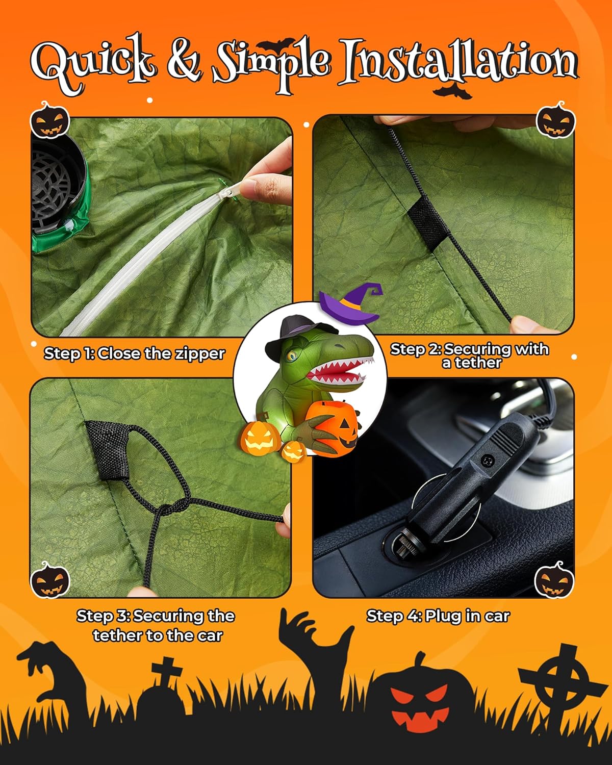 Minetom 3.44 FT Trunk or Treat Car Decorations Kit, Quick-Inflating Halloween Inflatable Outdoor Decorations, Blow-Up Animated Dinosaur Trunk Decor with 4 LEDs for Car, Halloween Outdoor Yard Decor