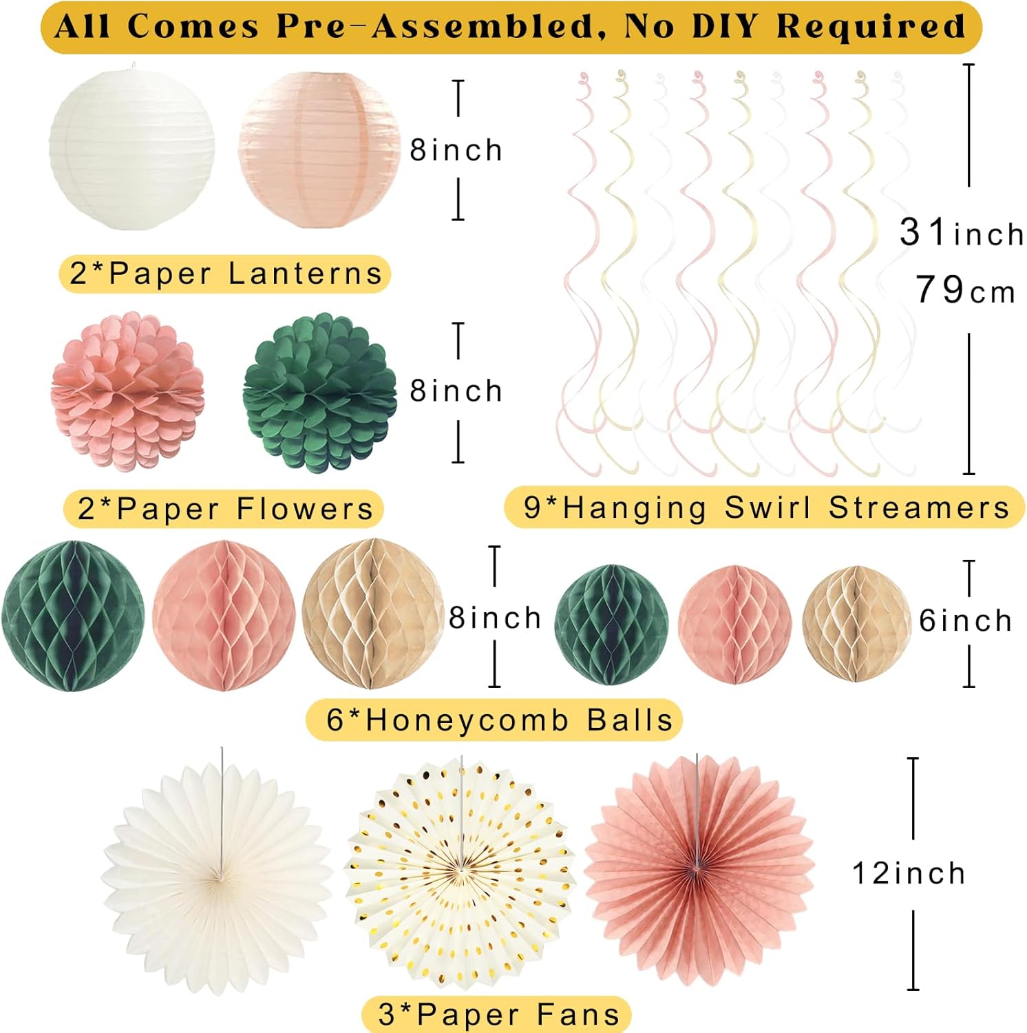 NO DIY 24pcs All-in-One Kit 1 x Happy Birthday Banner 2 x Paper Flowers 6 x Honeycomb Balls 9 x Hanging Swirls 1 x Circle Dots Garland 3 x Paper Fans 2 x Paper Lanterns